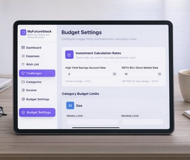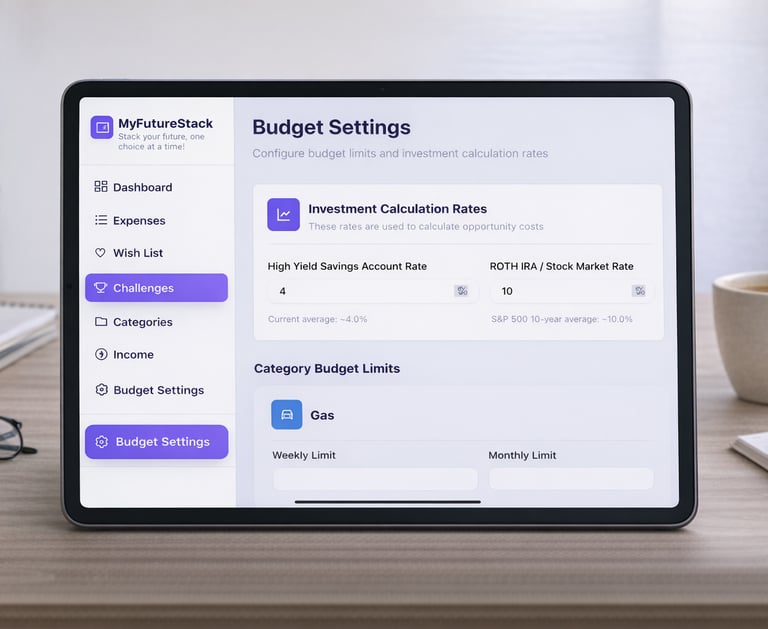 Your money, your rules. Set personalized spending budgets that match your lifestyle and financial goals. Adjust the high-yield savings and Roth IRA rates to reflect your actual returns, so every opportunity cost calculation shows you real numbers based on your real accounts. Take control of your financial future with settings that adapt to you.