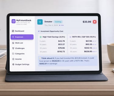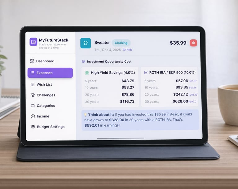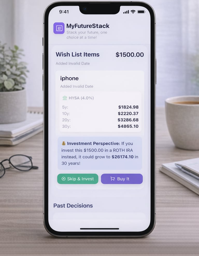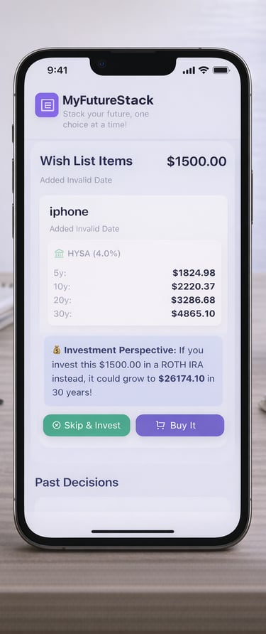 MyFutureStack helps you see every purchase as a choice between spending now or stacking wealth for your future. Every time you're about to buy something, we show you what that money could become if you invested it instead.