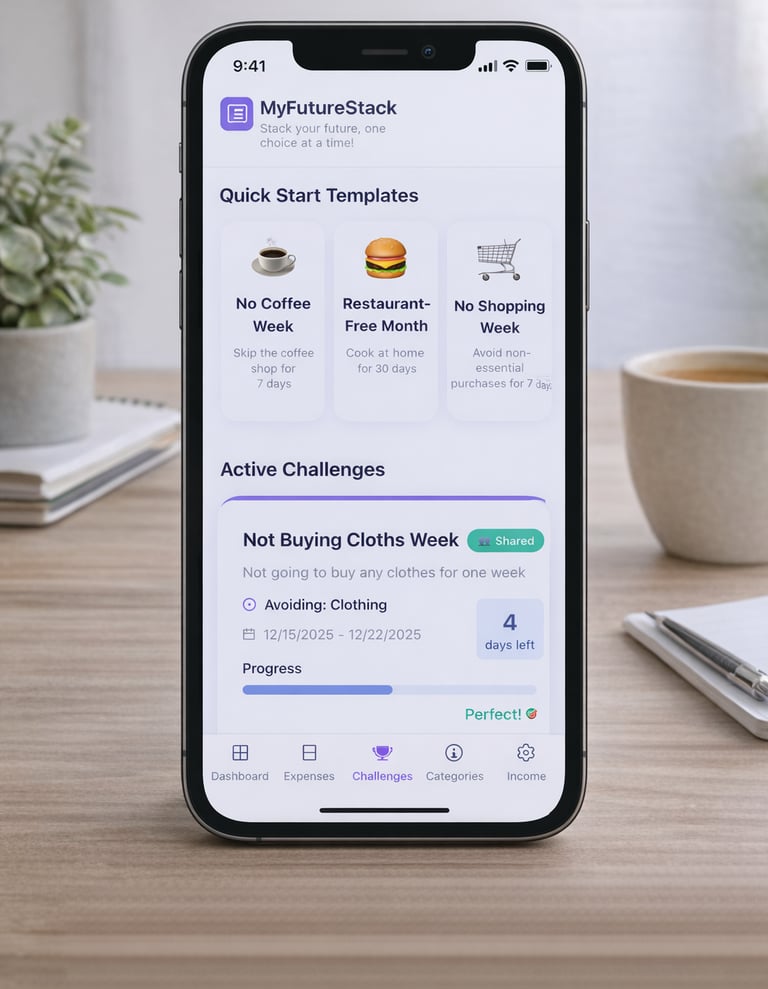 Small wins lead to big changes. Create personalized savings challenges like "No eating out for one week" or "Skip the coffee shop for 5 days" and watch your progress in real-time. Our countdown timer keeps you motivated, and when you complete a challenge, you earn a badge that celebrates your commitment. Turn temporary sacrifices into lasting habits—one challenge at a time.